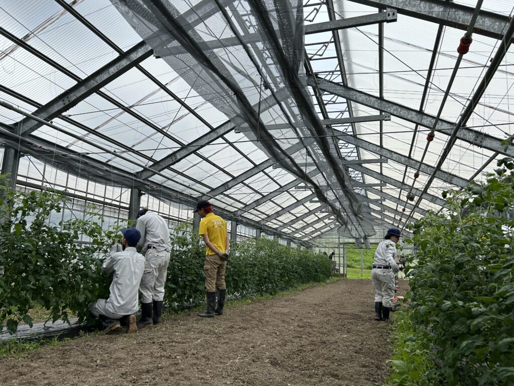 先輩、竹田氏が動物お世話やトマトの、誘引など指導にあたります。
