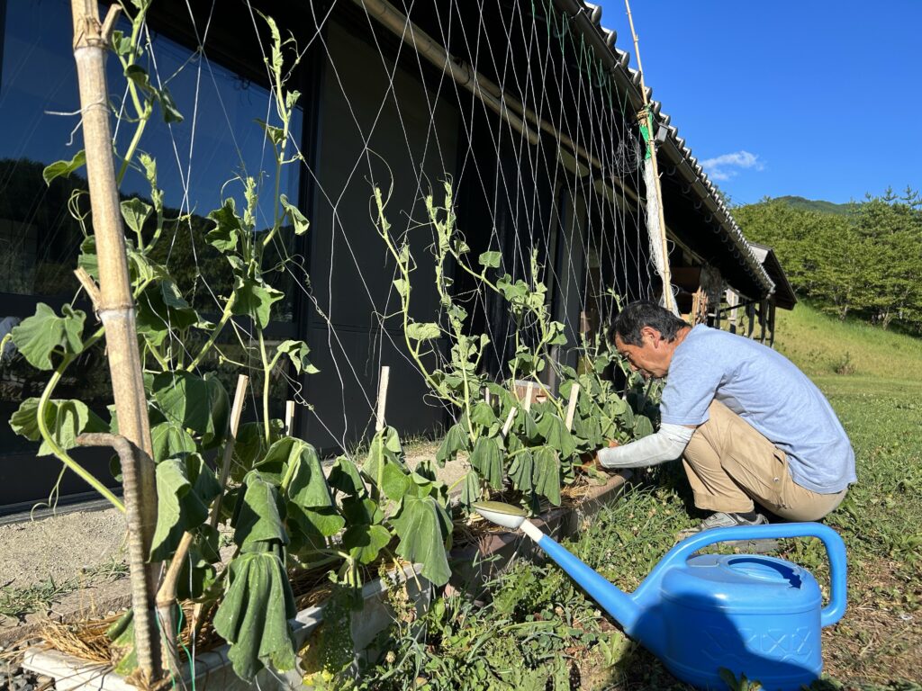 じーちゃんがお世話する、緑のカーテンは水やりのおかげでしんなりしつつも日々成長してます。