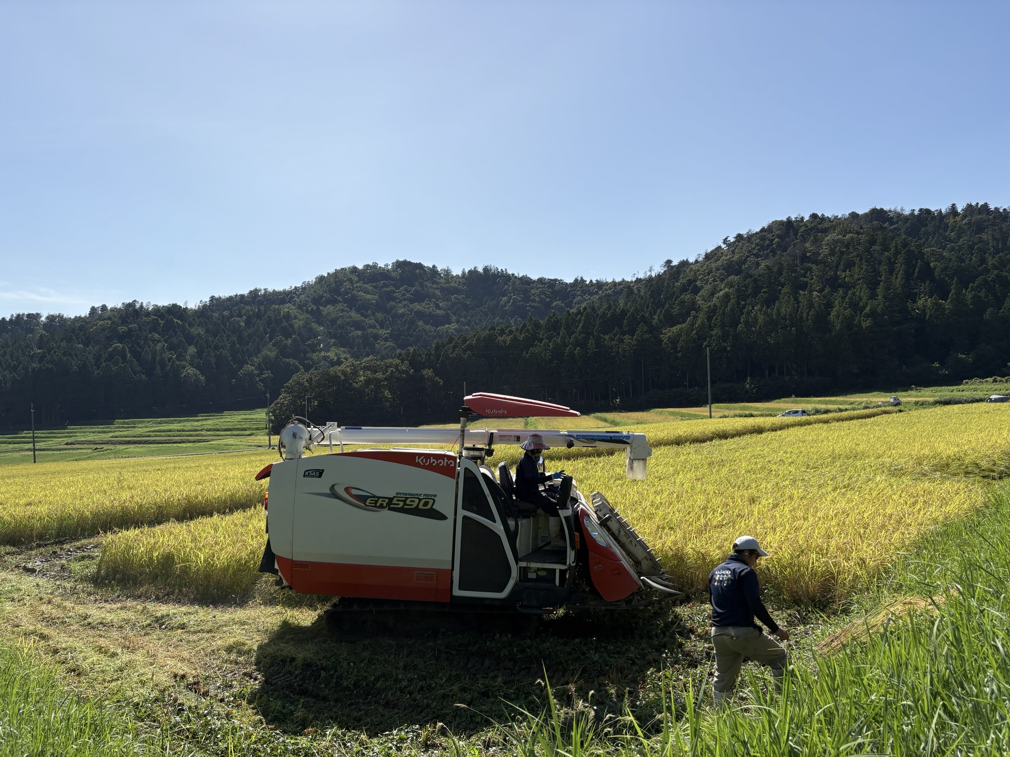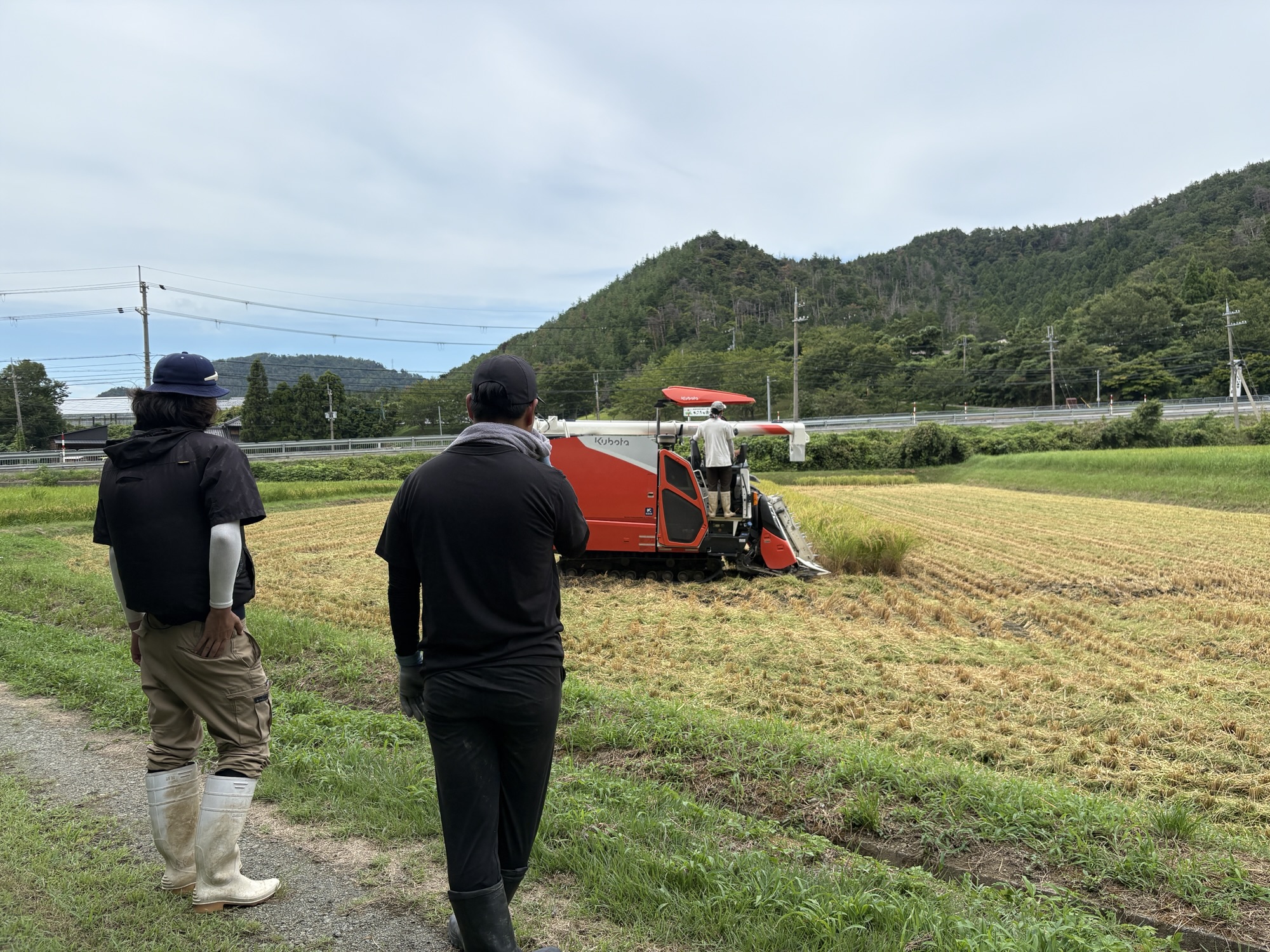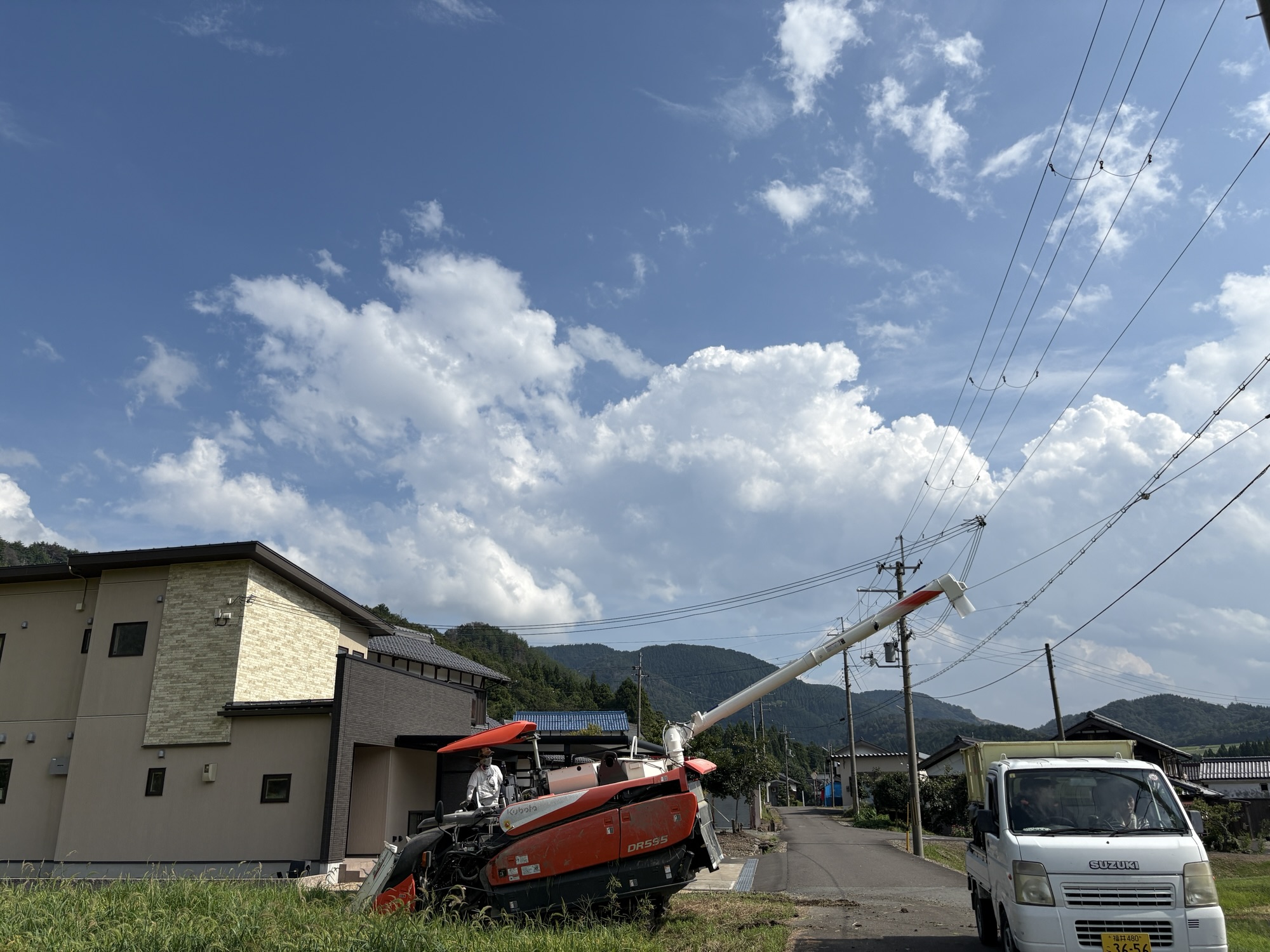 いつもコンバインを先導してくれる務氏ですが