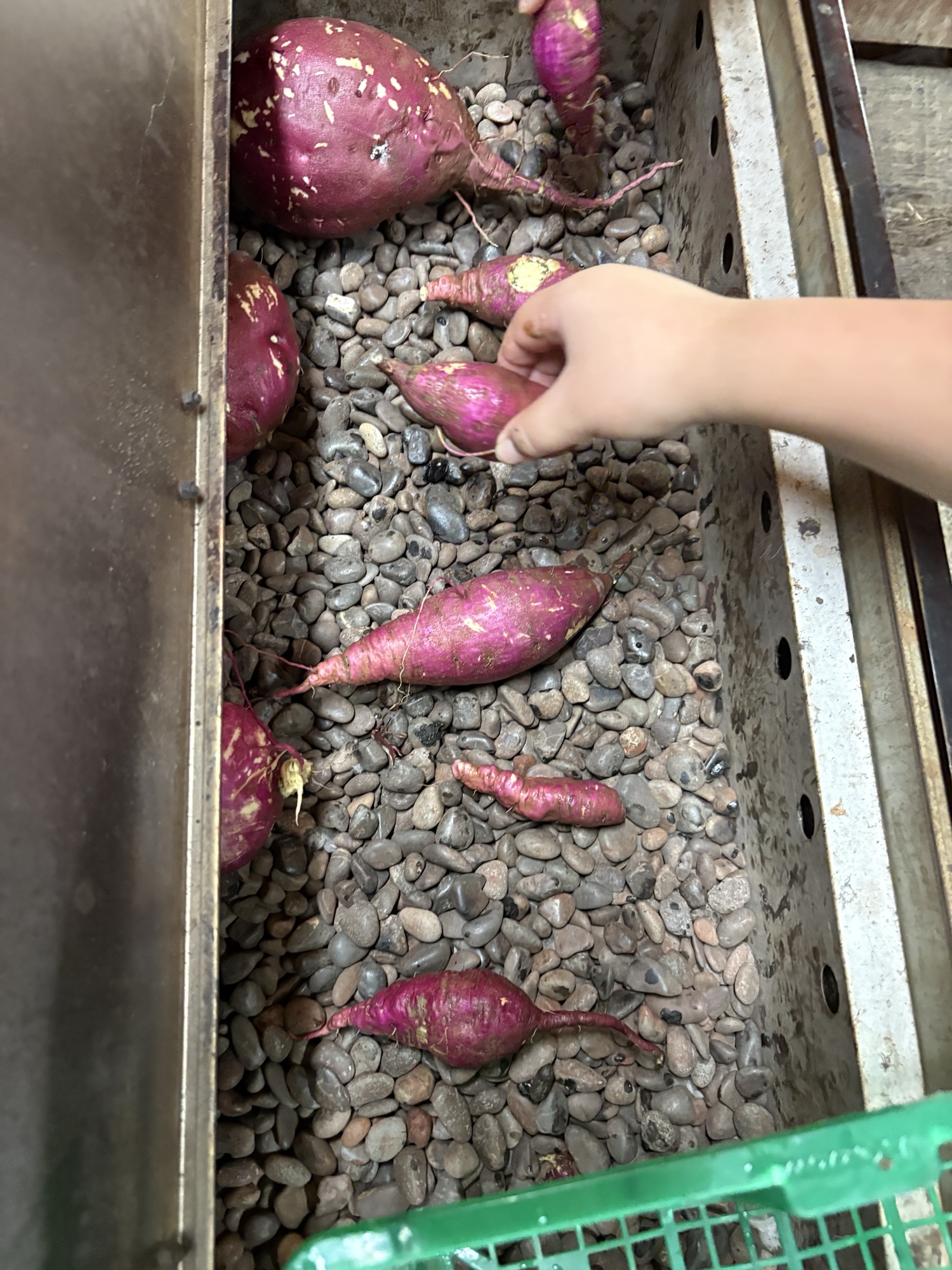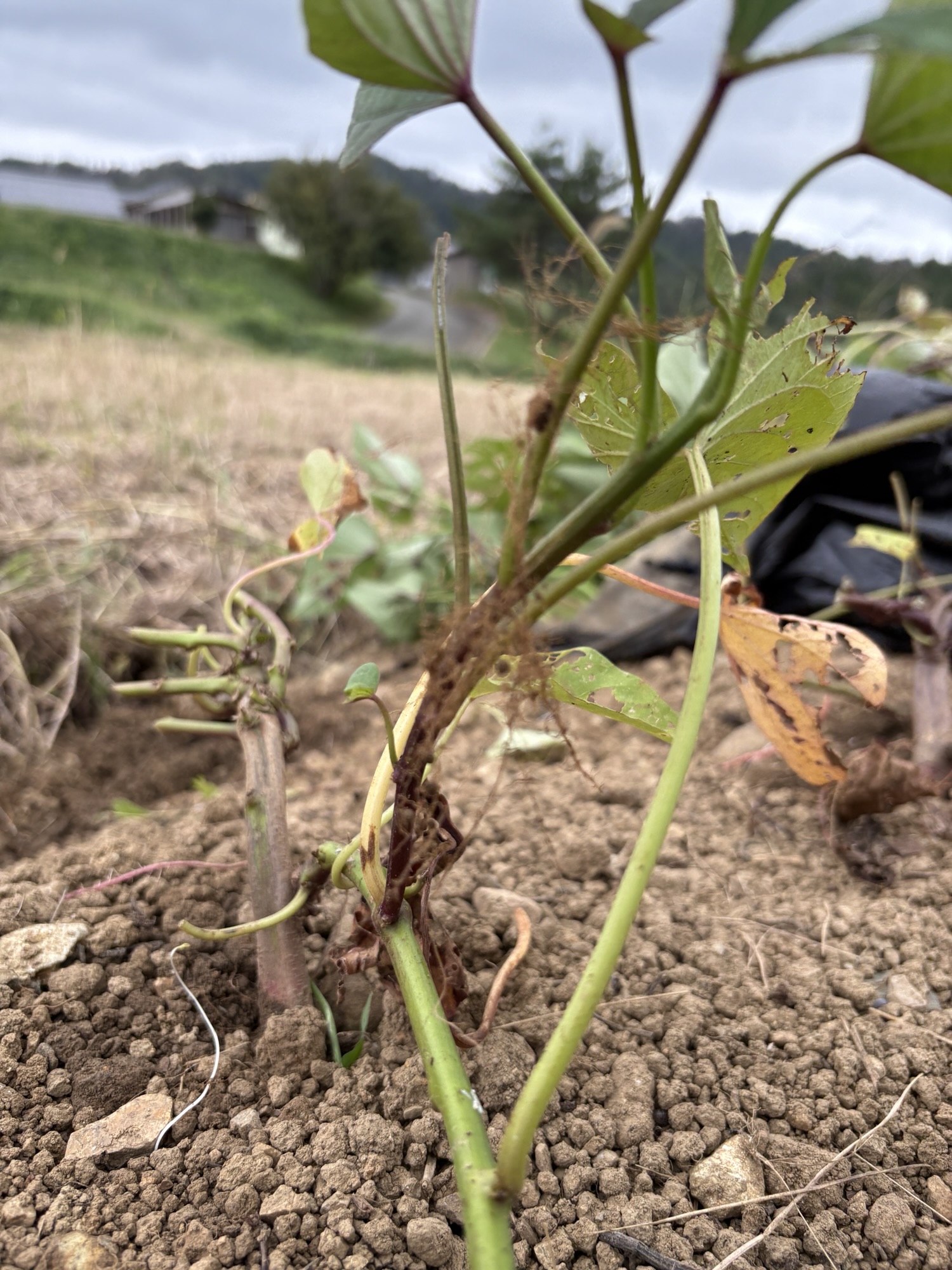 試し堀りすると、茎も沢山ですがボチボチで大きい芋もありました。