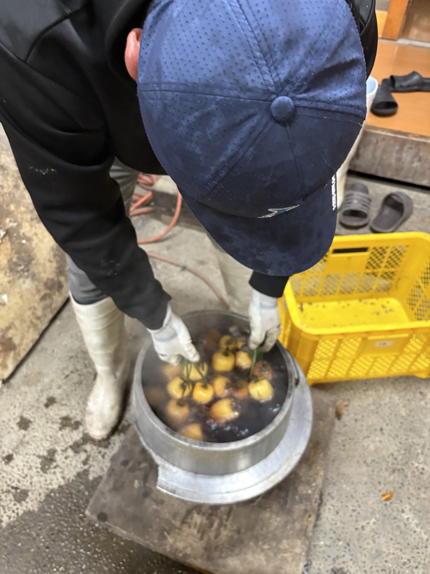 カビ防止の為の湯がき作業の渋汁を使い