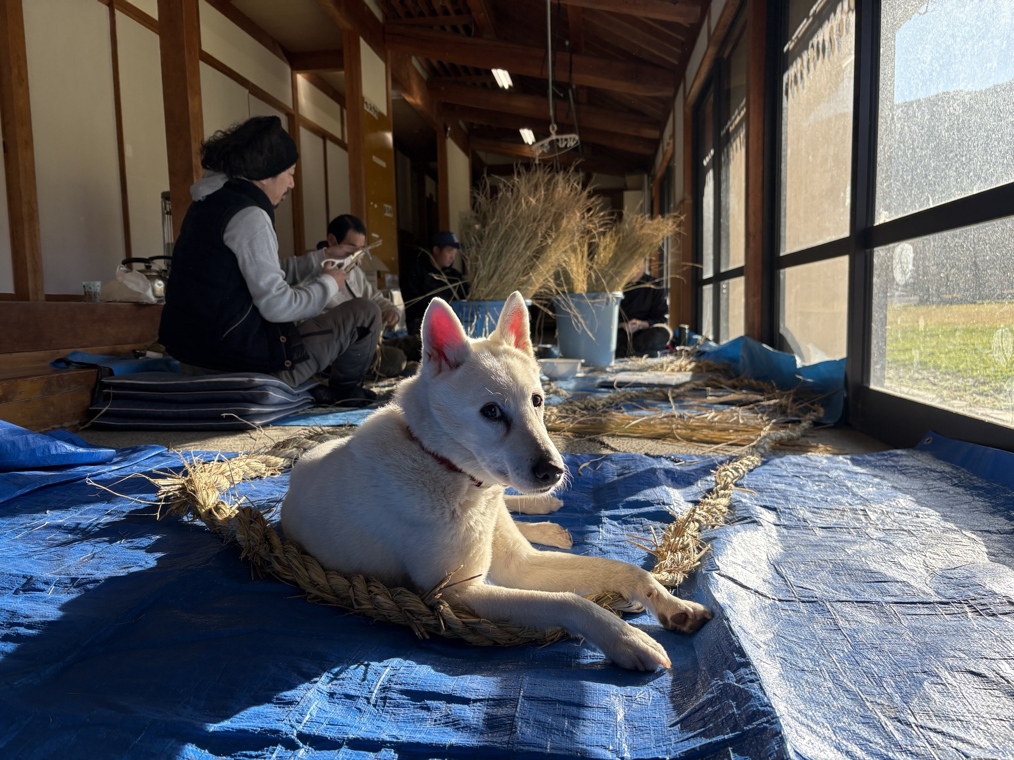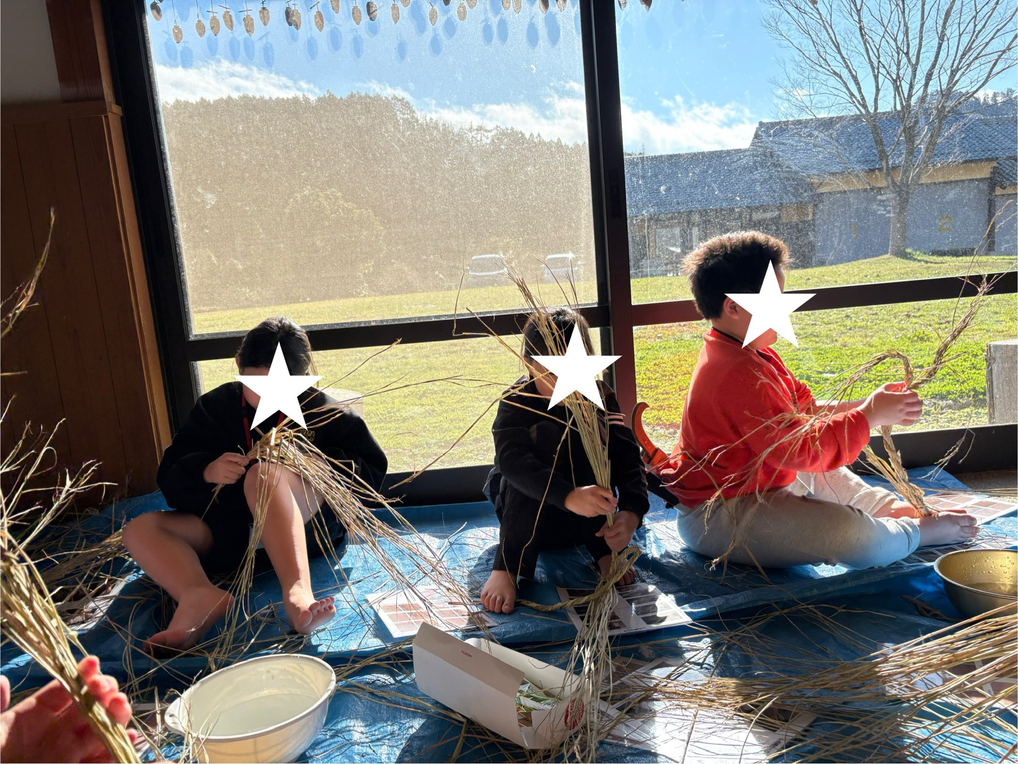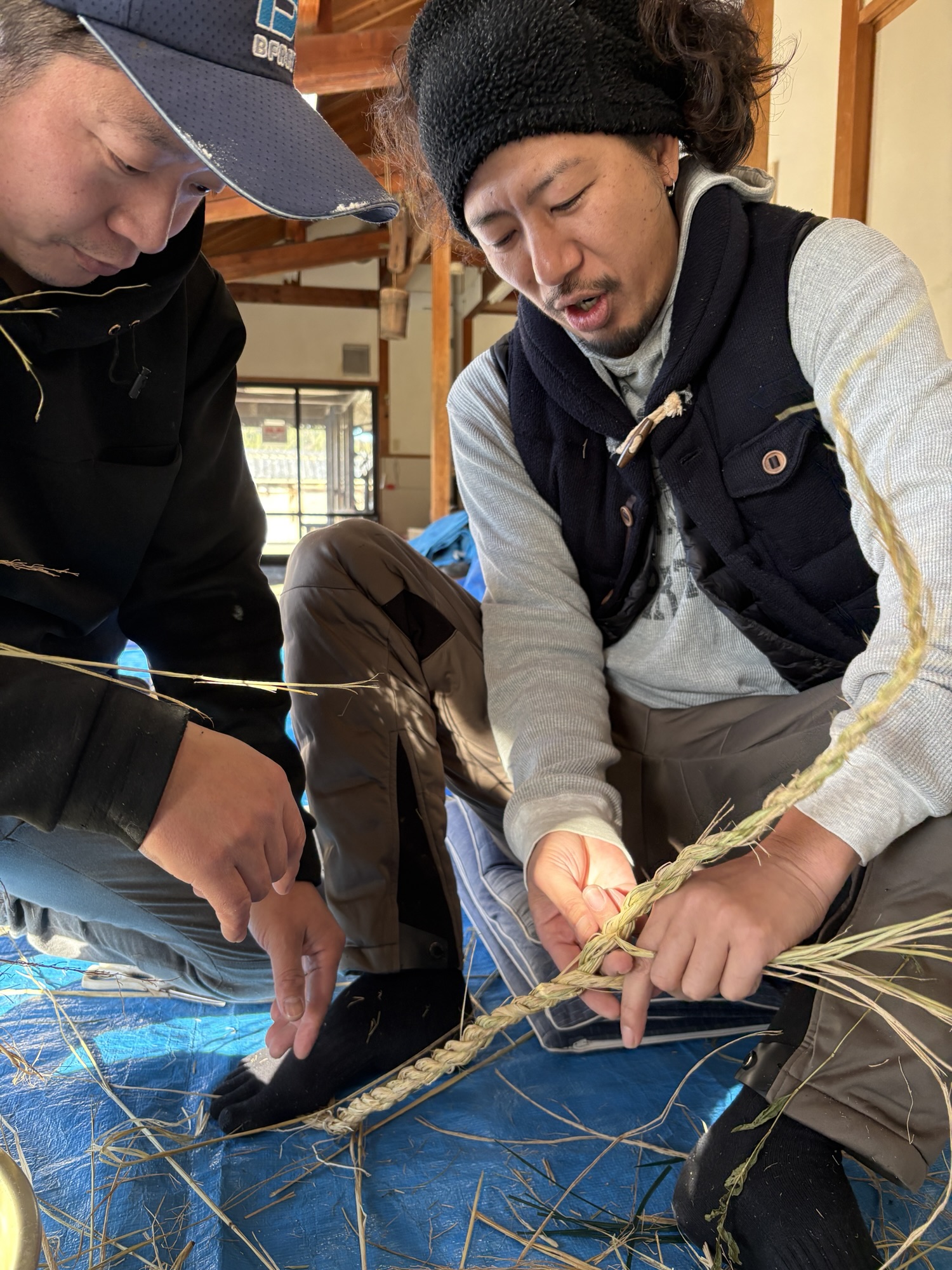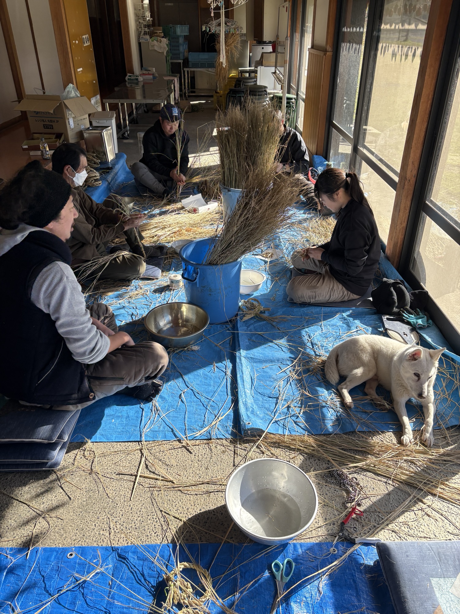 餅米のワラで正月飾りのしめ縄作りに