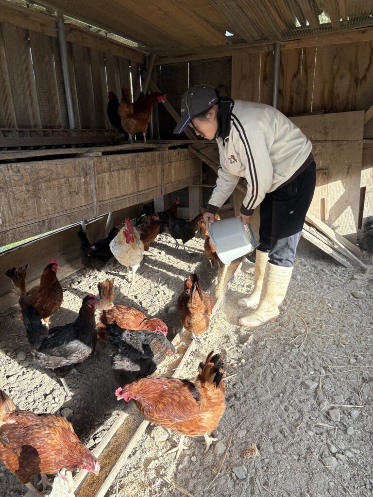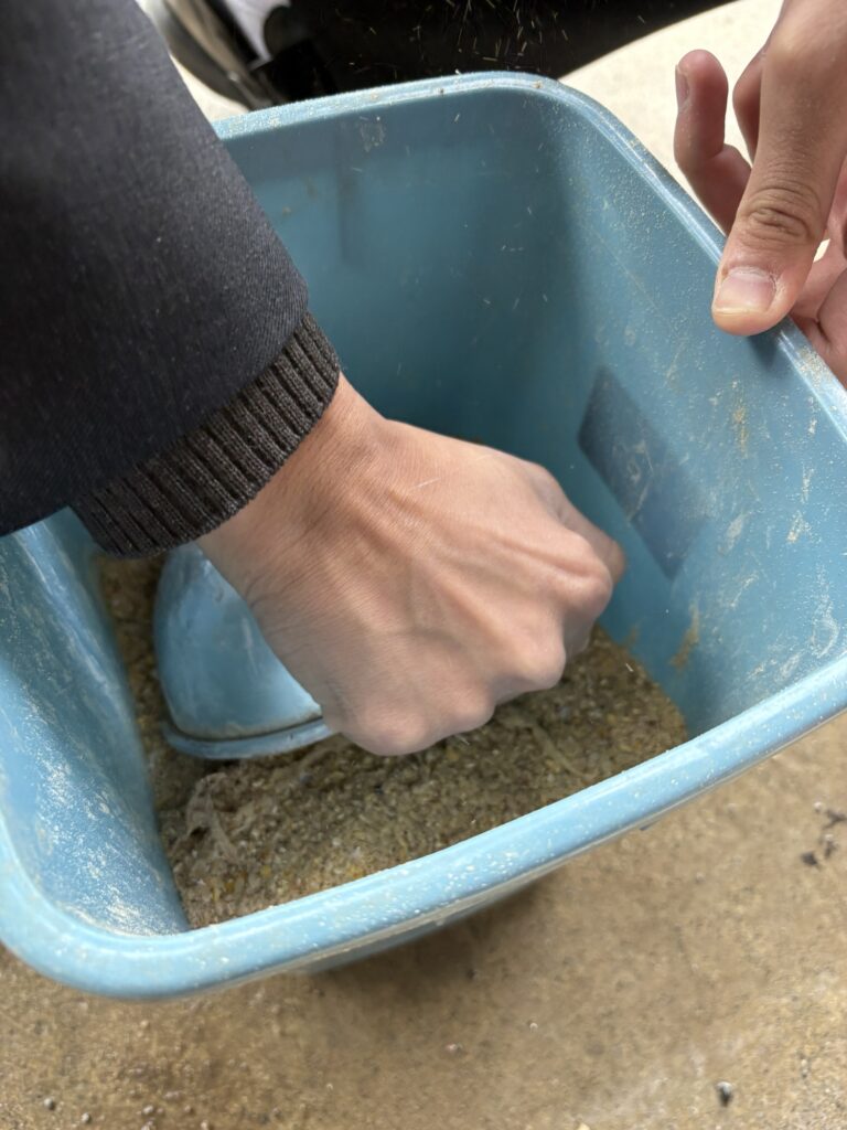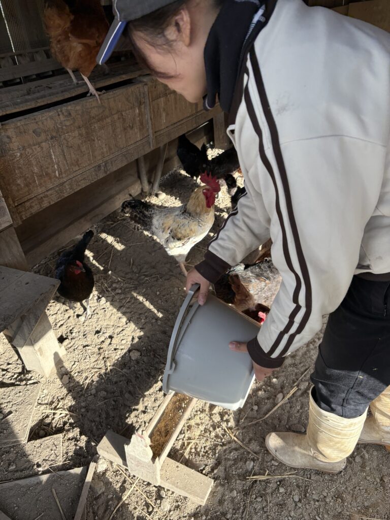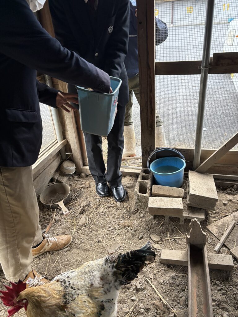 初日は生徒さんと先生が粉にした餌を持って実際に餌やりと採卵。