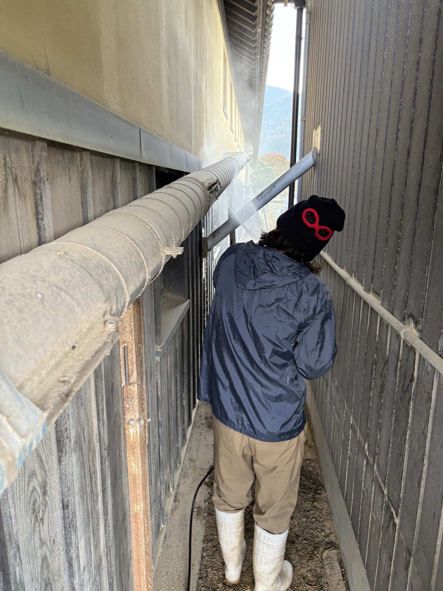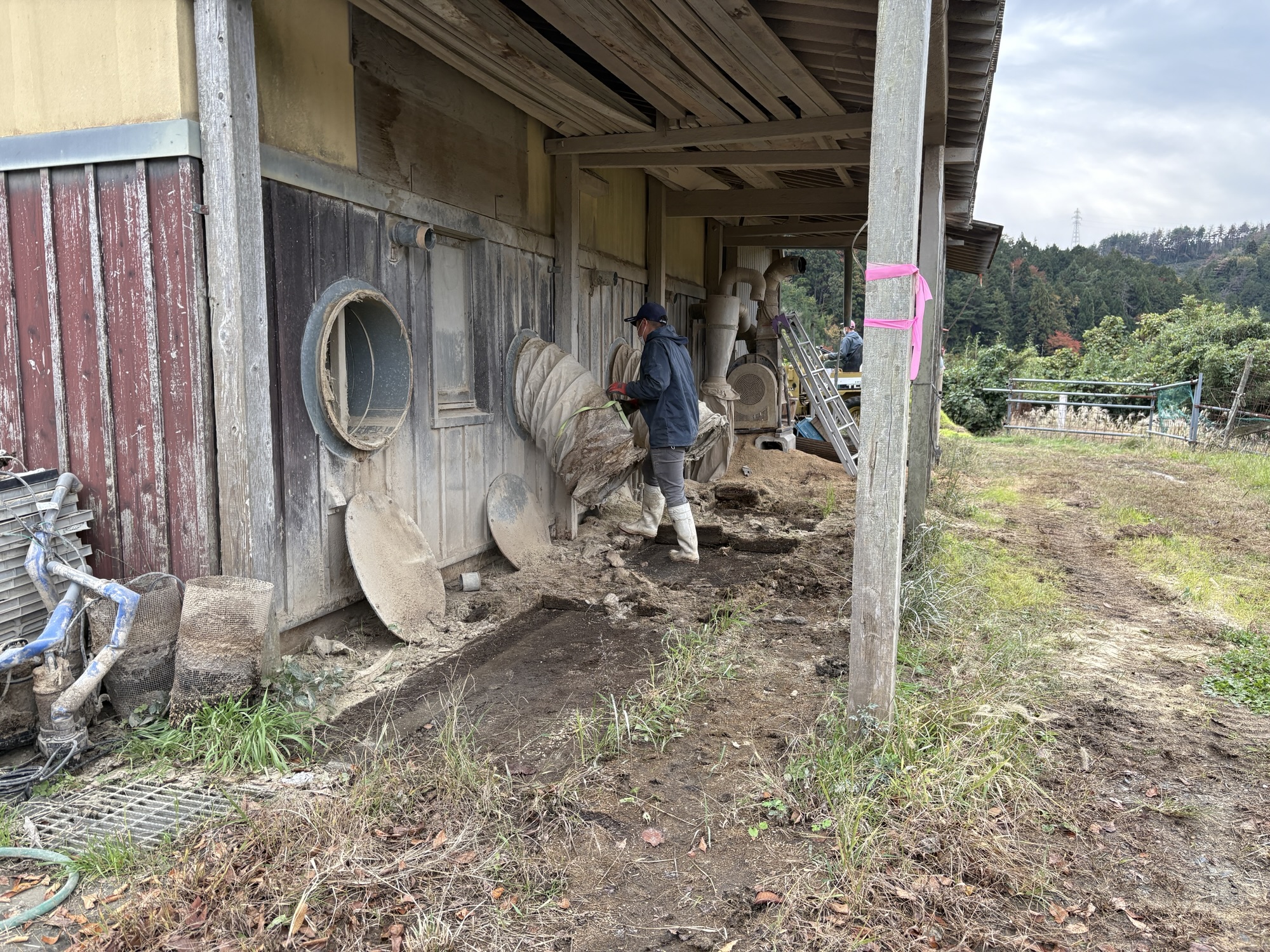 乾燥機使用で籾殻や粉塵で汚れた壁やら装置を